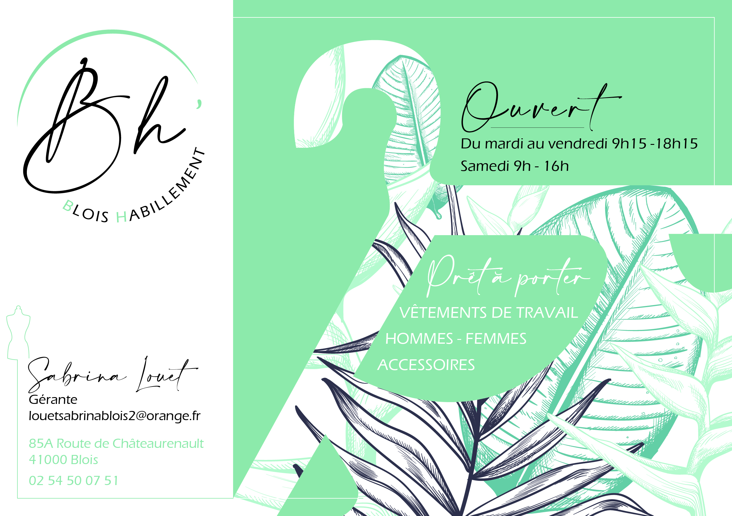 Créée en 2010 par Marie-Laure Helyot, Blois Habilllement a été repris en 2021 et renommé Blois Habillement 2 - en faisant la boutique de référence dans le département. Le concept est innovant, original et rare. Il consiste à proposer des vêtements bien spécifiques à différents publics qui savent désormais où trouver leur bonheur : les seniors, les personnes d'une taille et d'une corpulence supérieure à la moyenne, les professionnels de l'industrie, de la cuisine, de la peinture (liste non exhaustive). Notre fondatrice jouit d'une expérience qui nous permet de faire les bons choix puisqu'elle a été, durant de nombreuses années, agent de comptabilité dans le secteur de l'habillement.